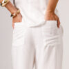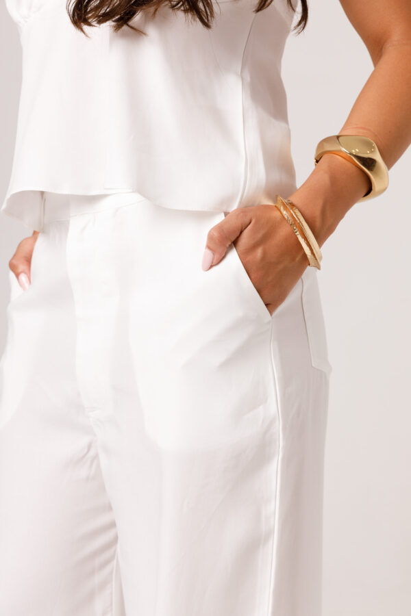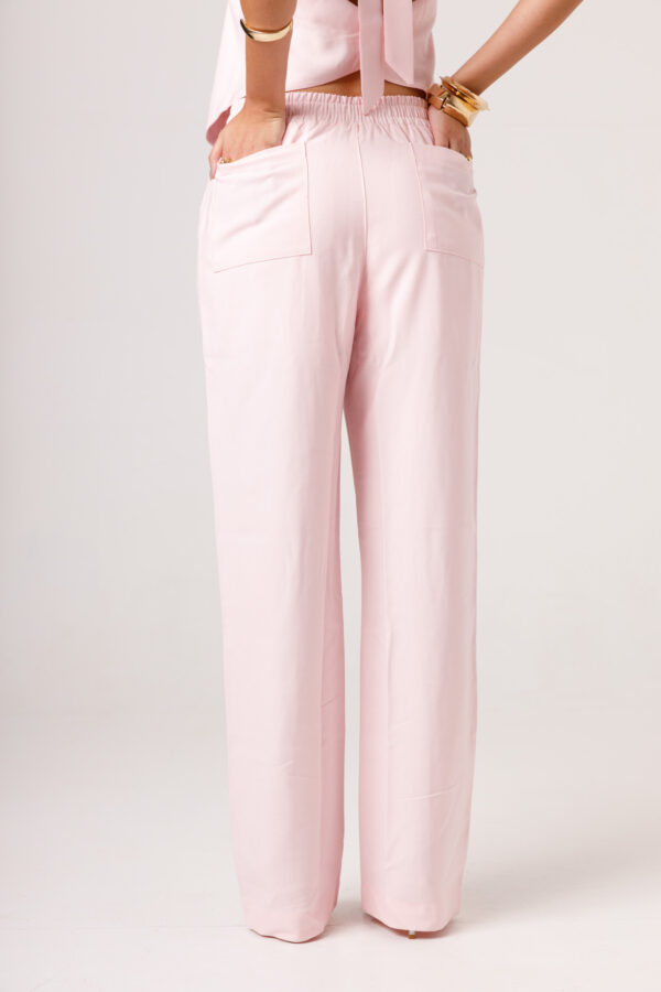 Calça de modelagem reta com bolsos e proposta elegante disponível nas cores Branco, Rosa e Preta.