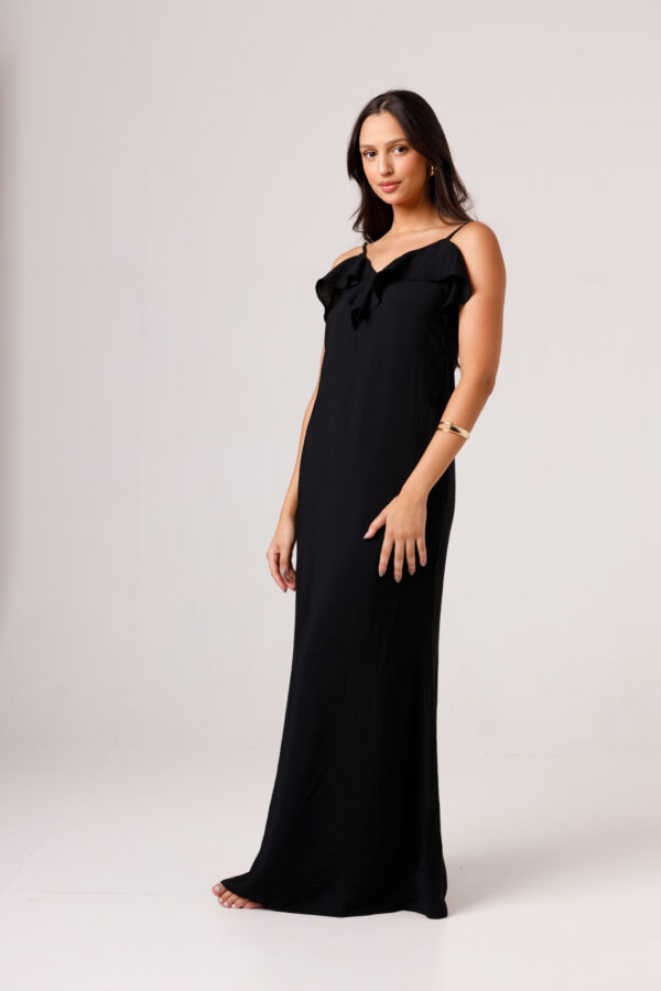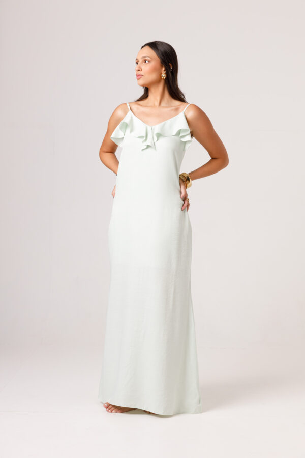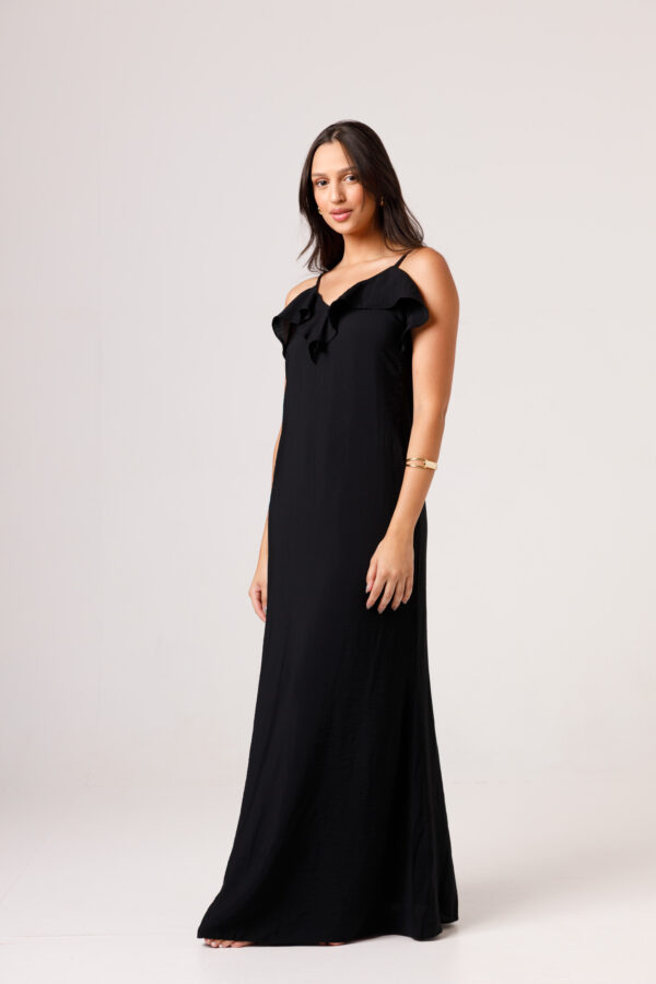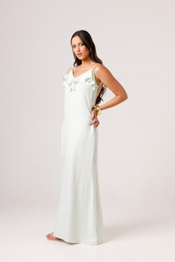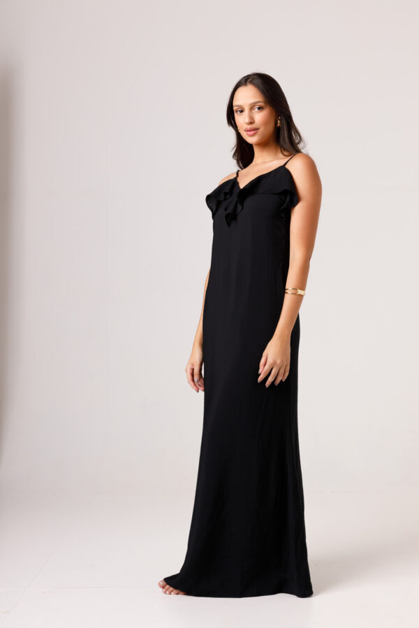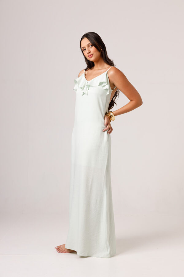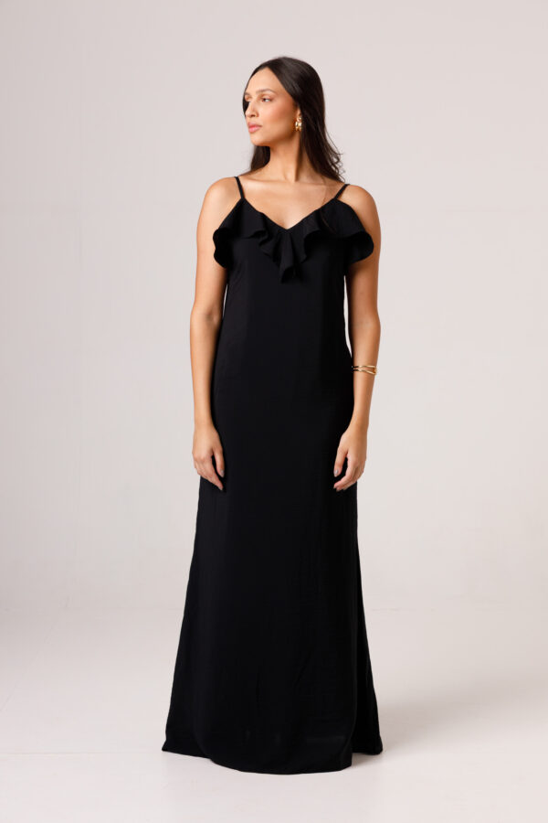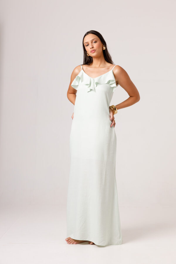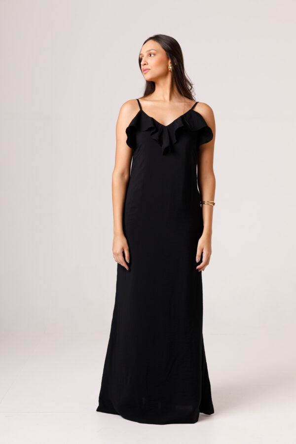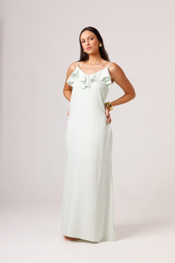 Vestido longo com babado aplicado no busto, alças finas e costas abertas disponível nas cores Preto, Branco e Verde.