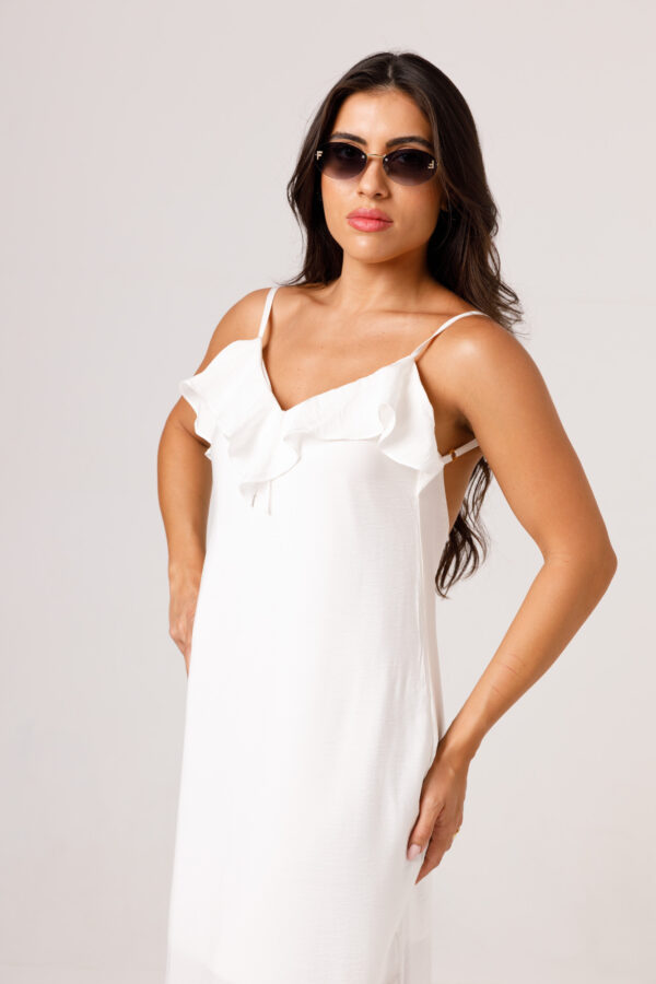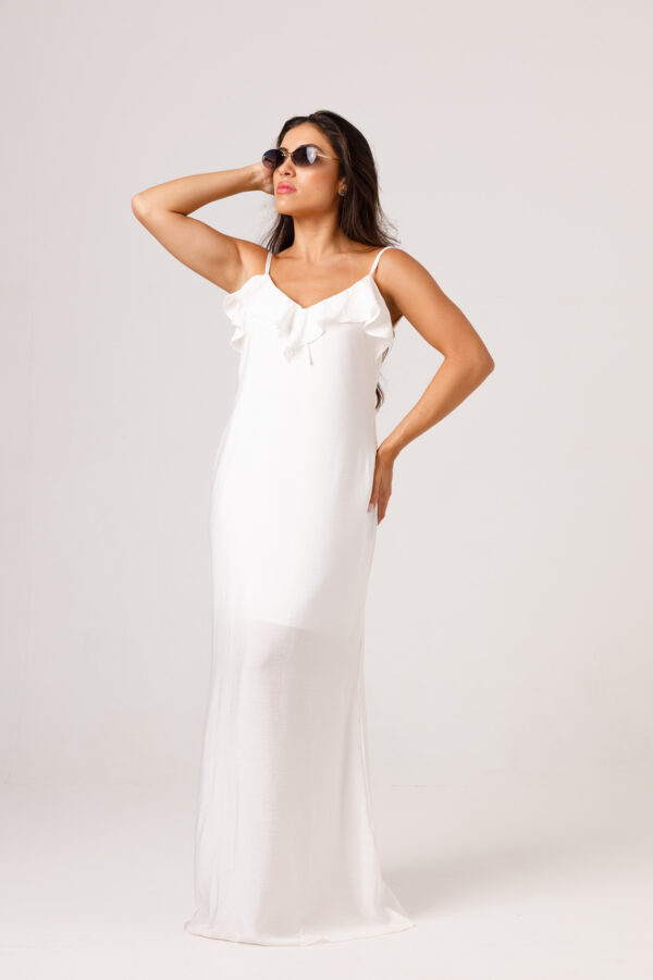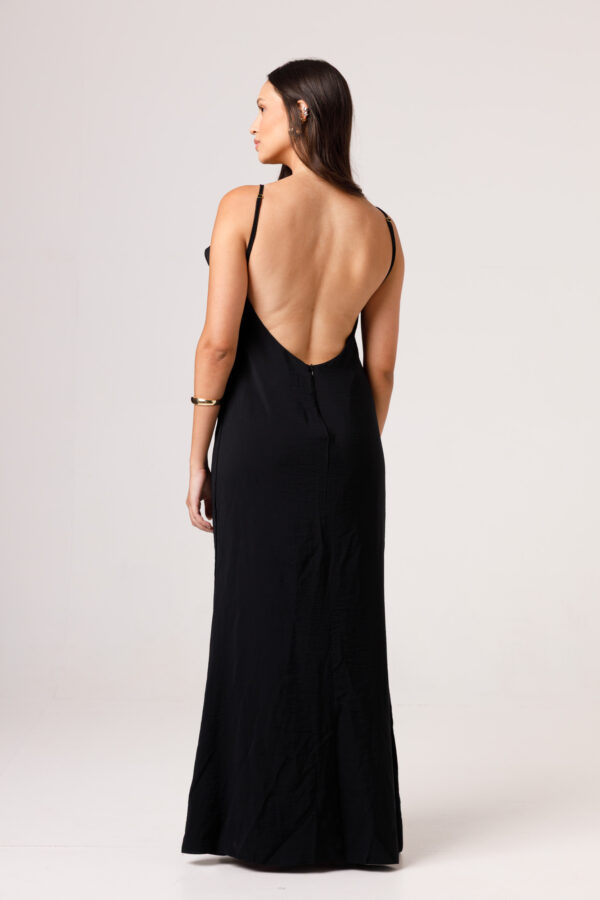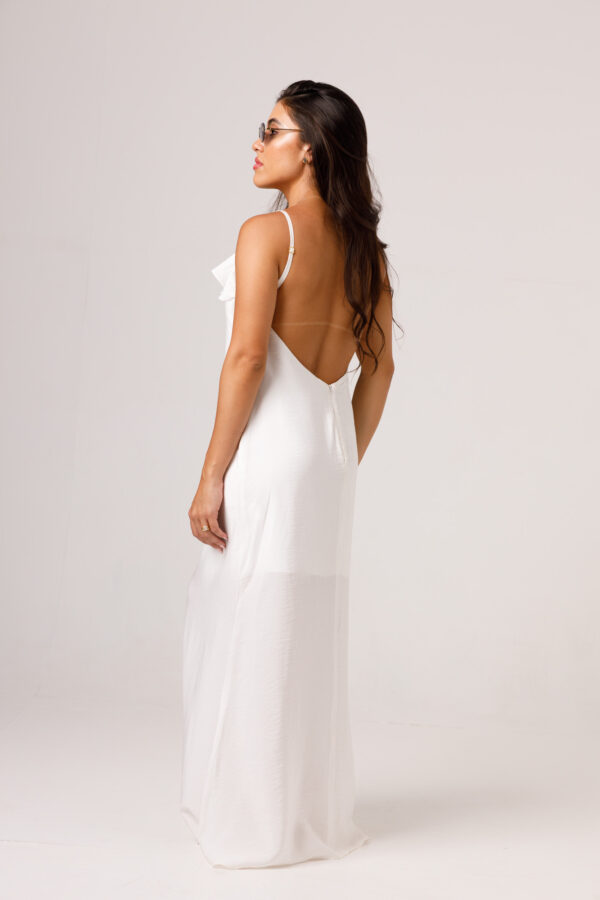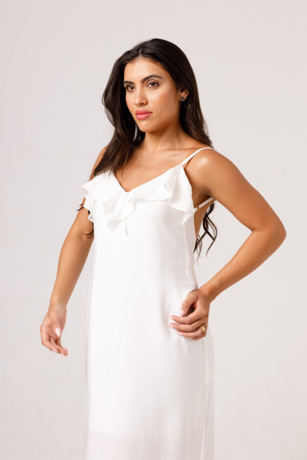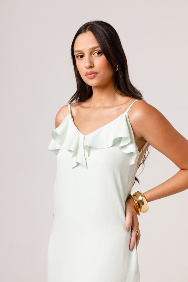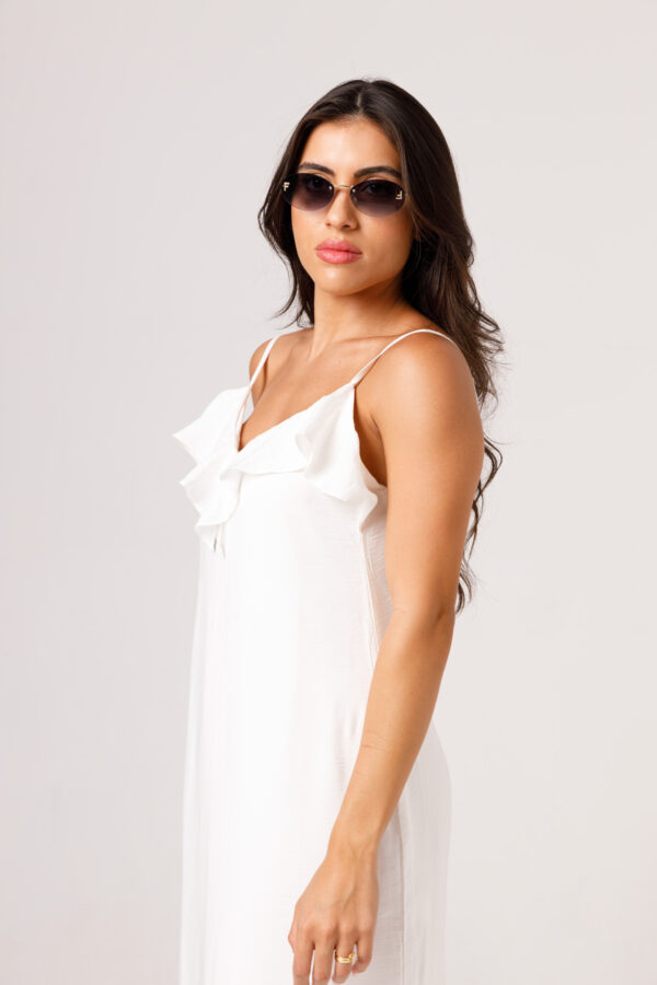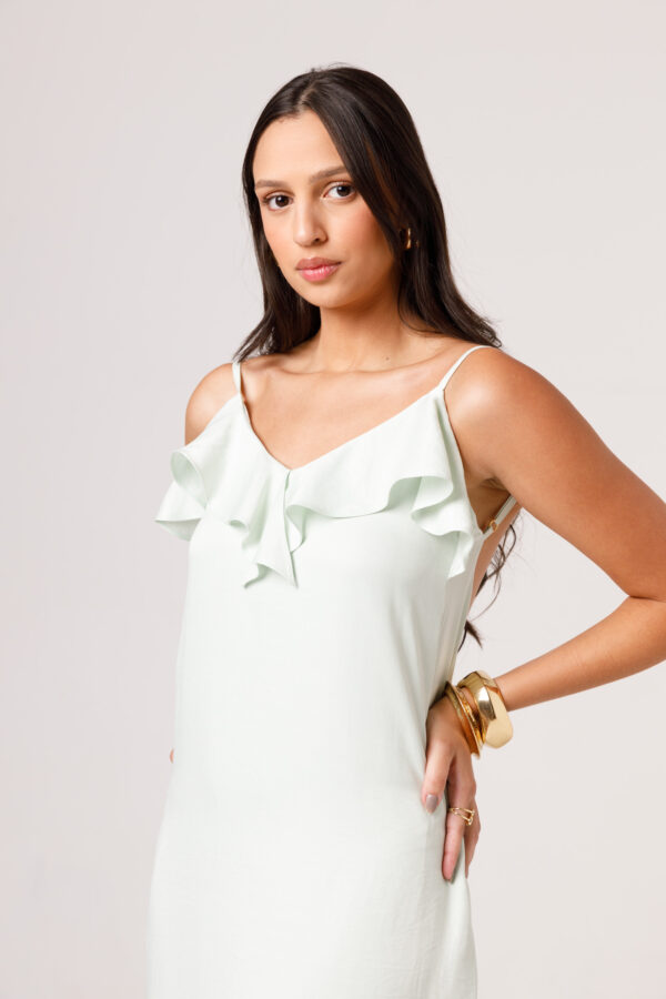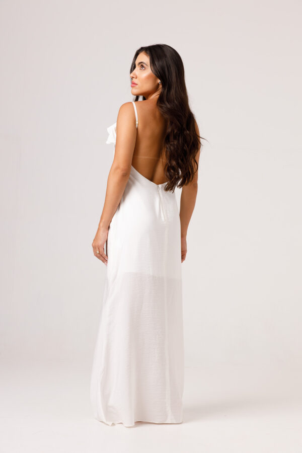 Vestido longo com babado aplicado no busto, alças finas e costas abertas disponível nas cores Preto, Branco e Verde.