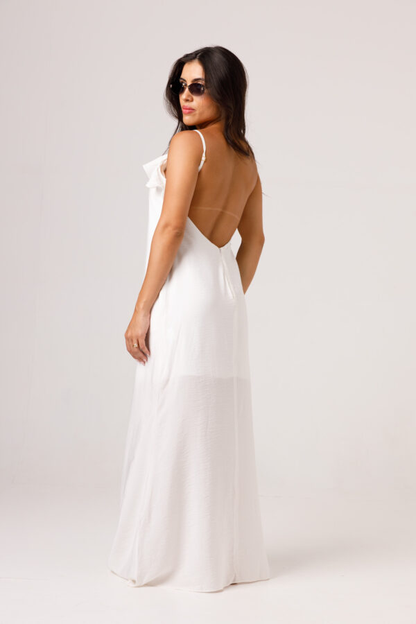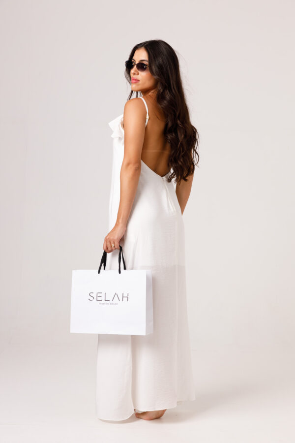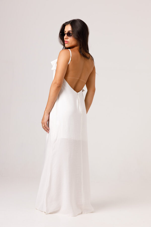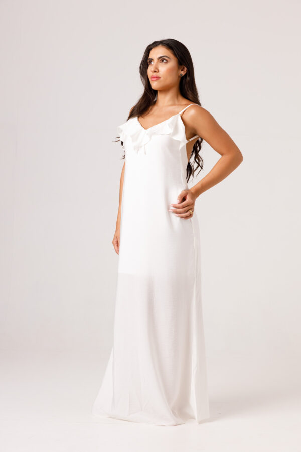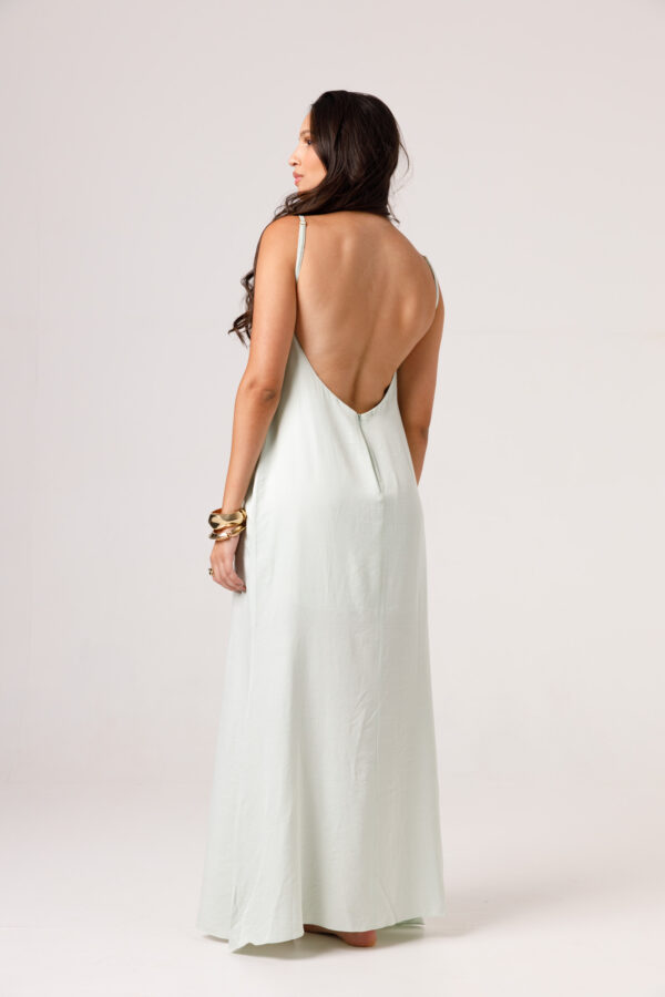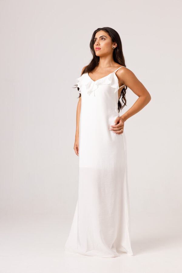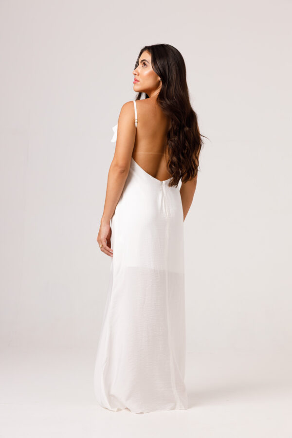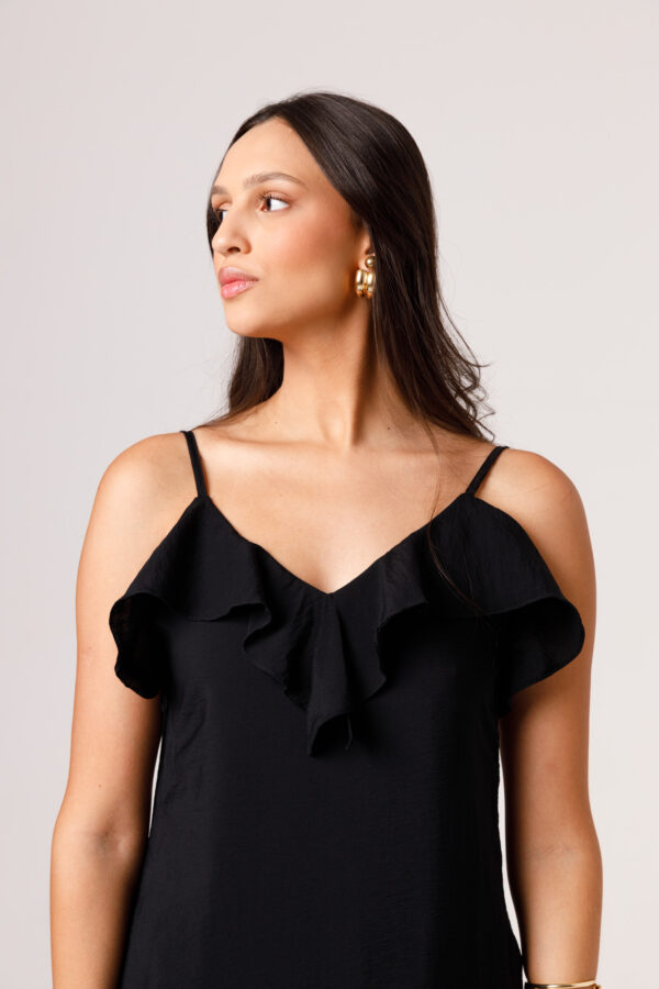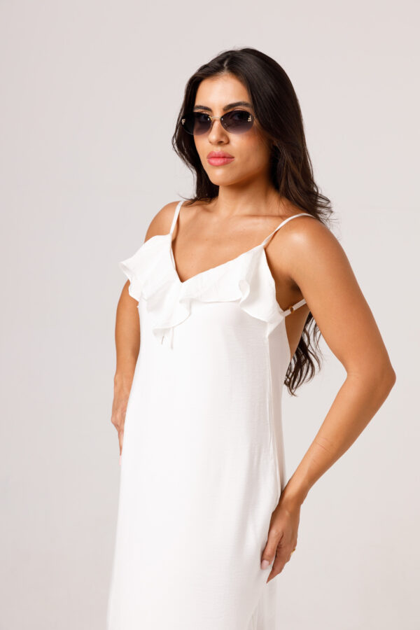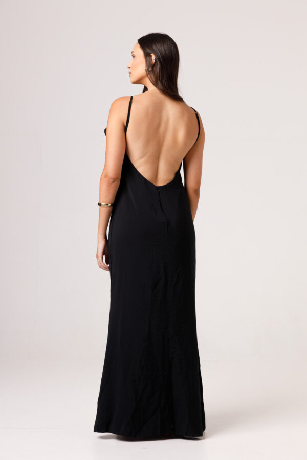 Vestido longo com babado aplicado no busto, alças finas e costas abertas disponível nas cores Preto, Branco e Verde.
