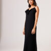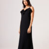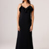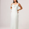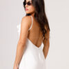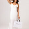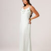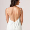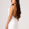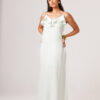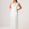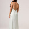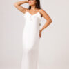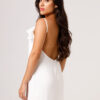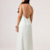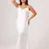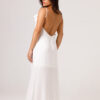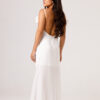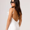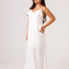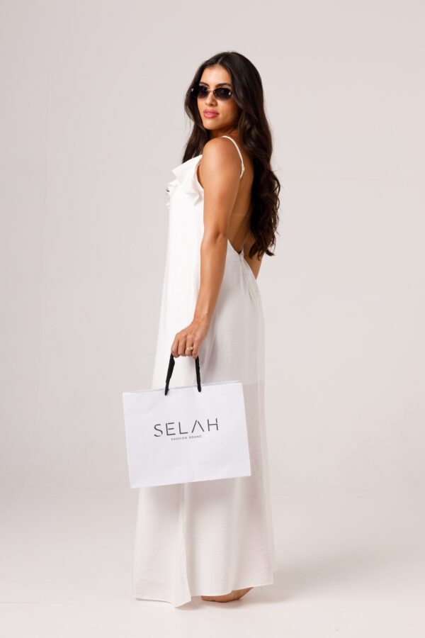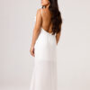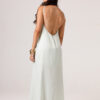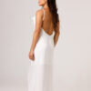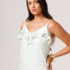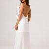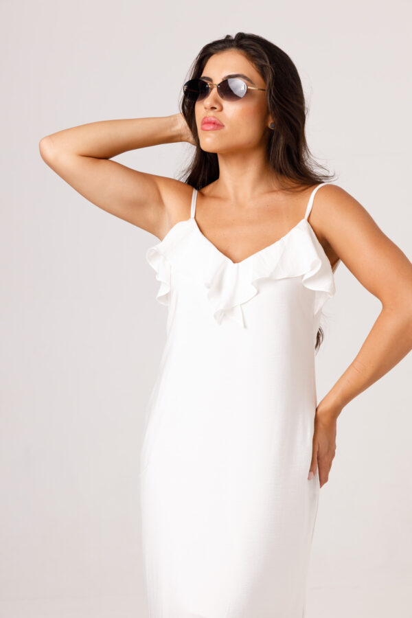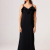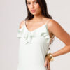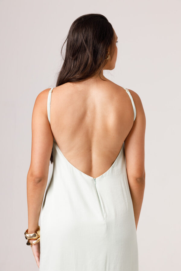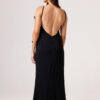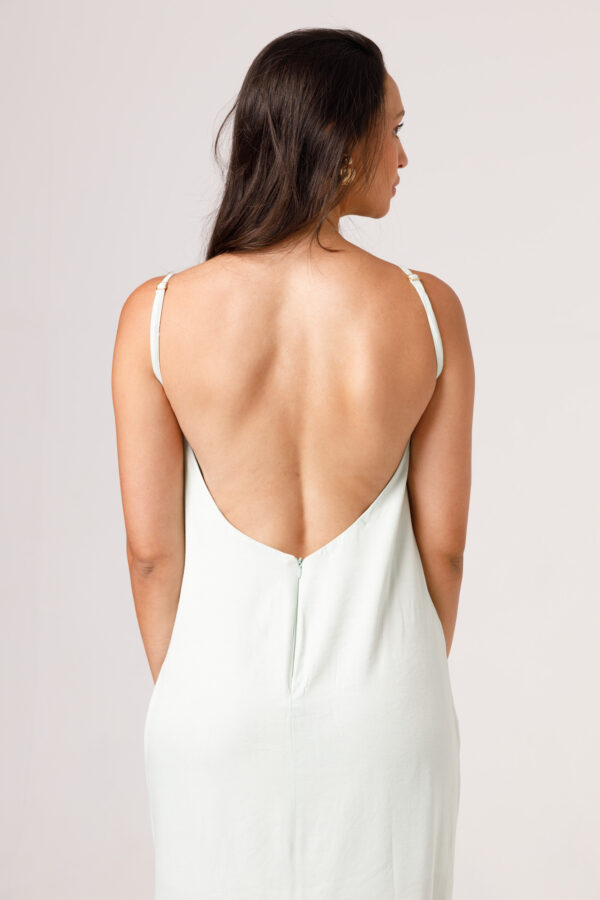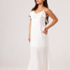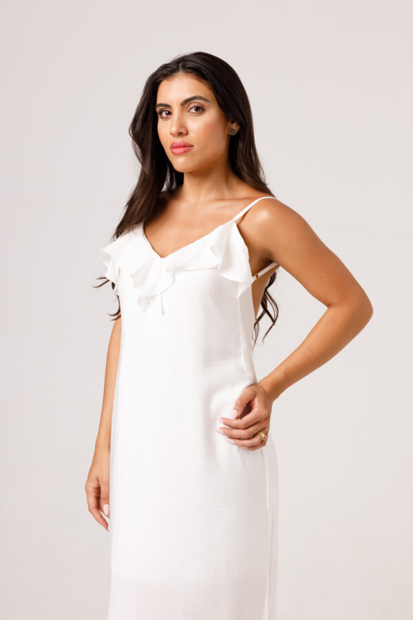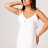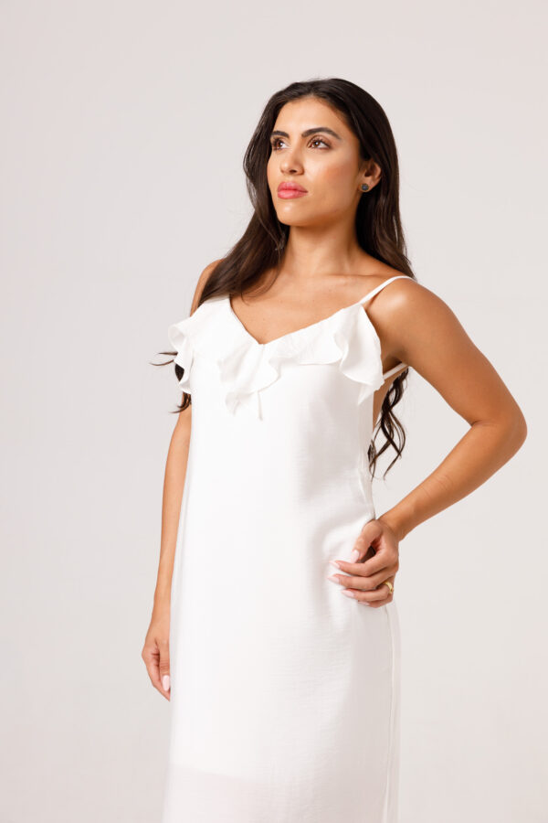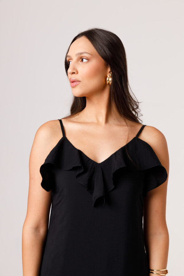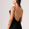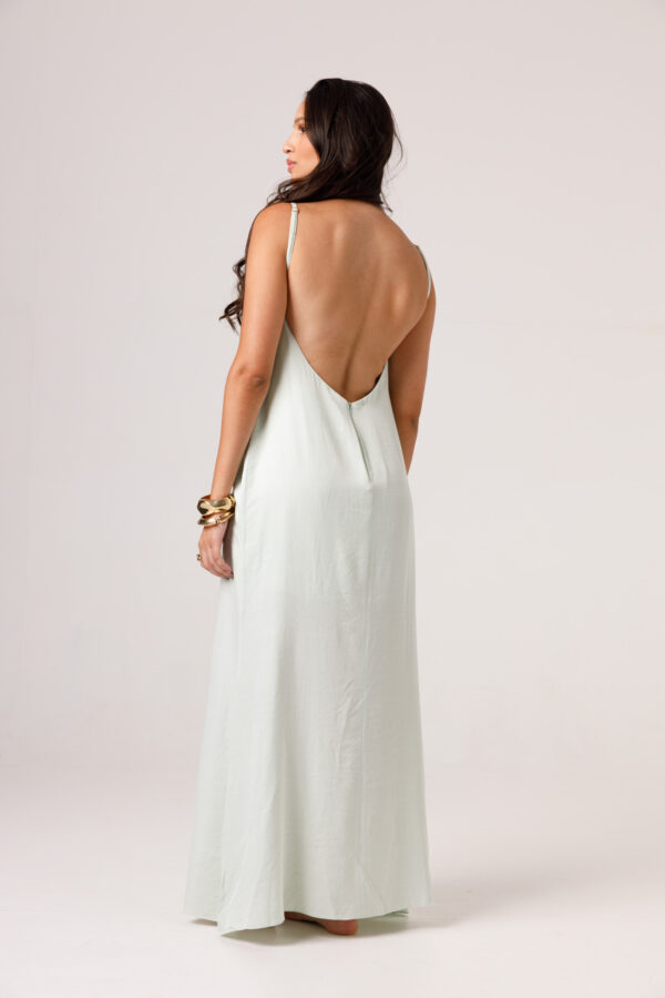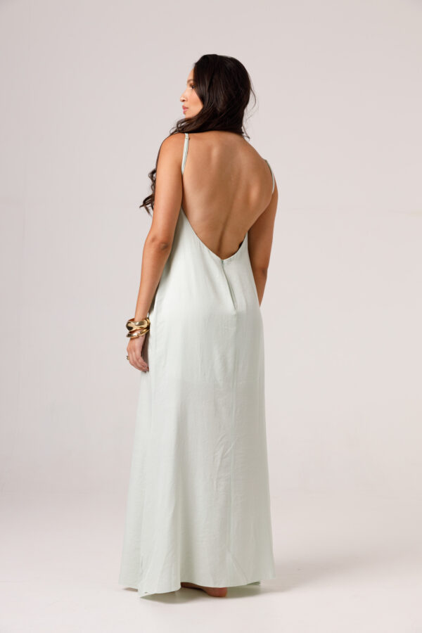 Vestido longo com babado aplicado no busto, alças finas e costas abertas disponível nas cores Preto, Branco e Verde.