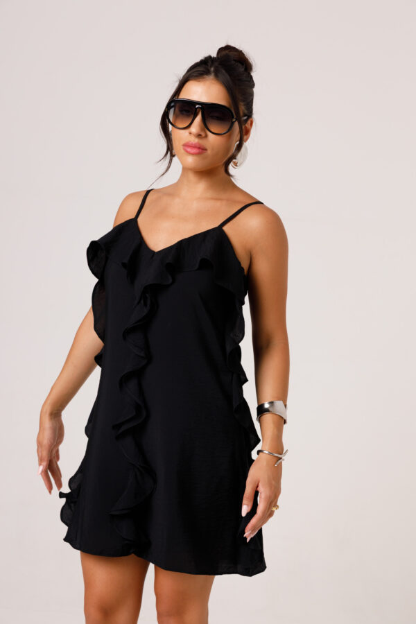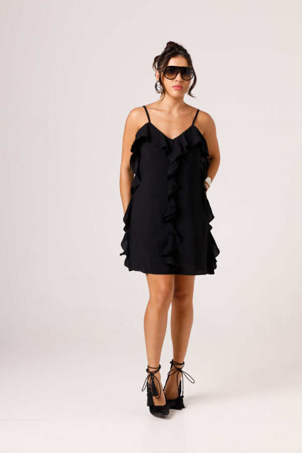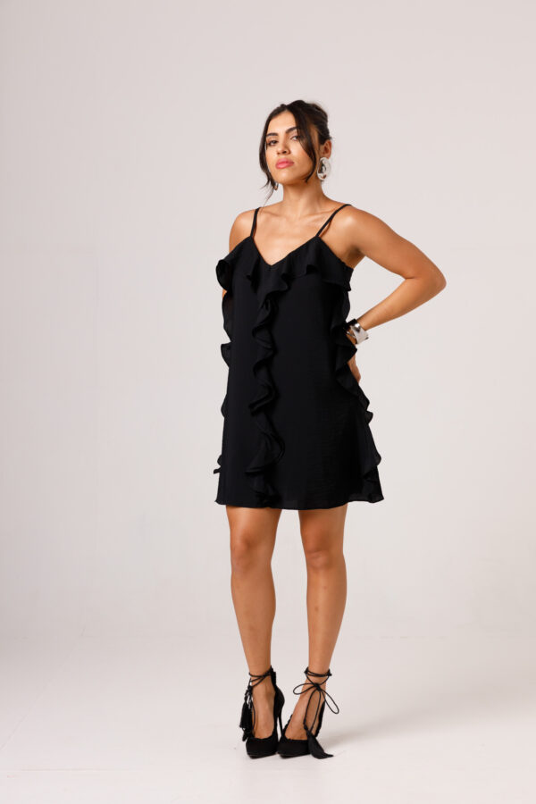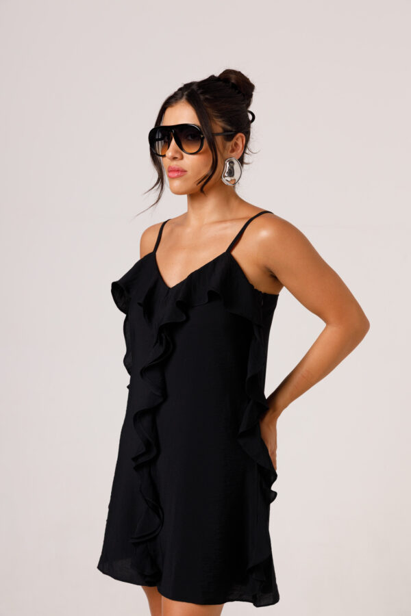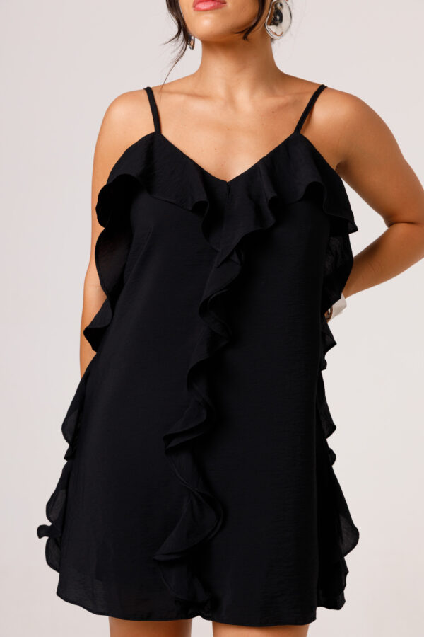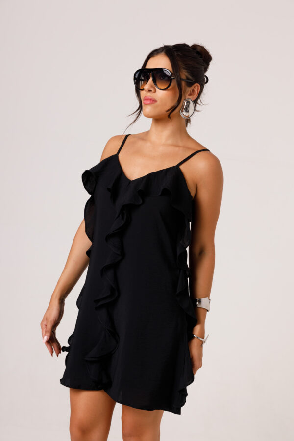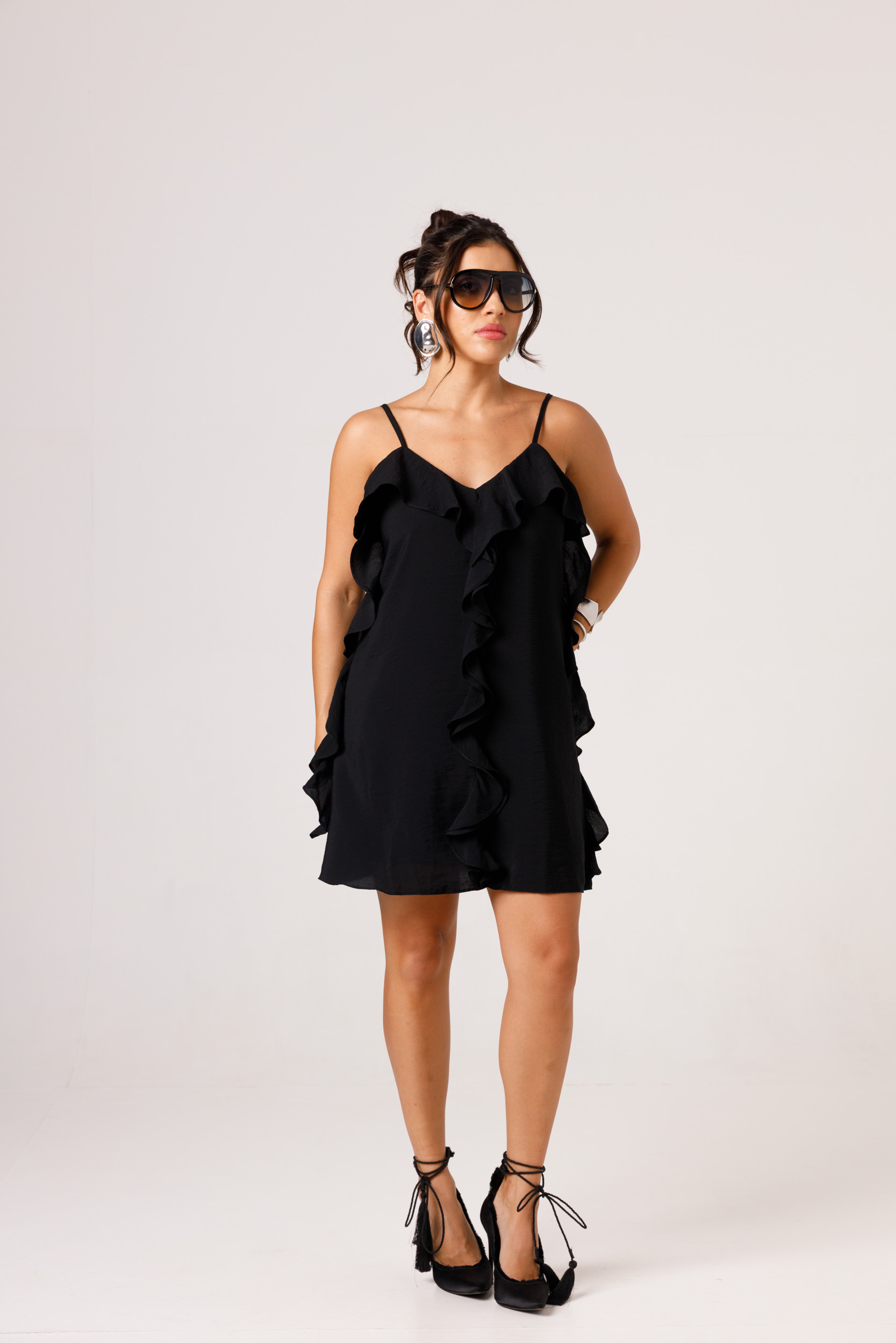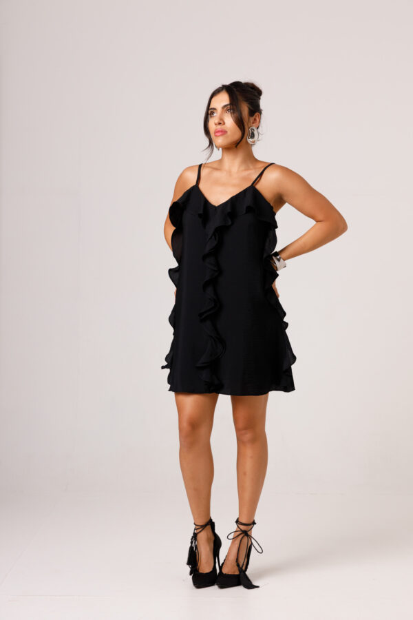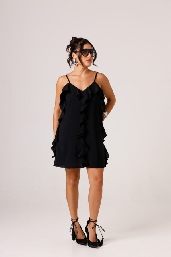 Vestido curto com babados frontais, alças finas e modelagem soltinha disponível nas cores Preto.