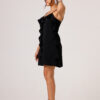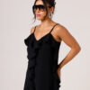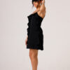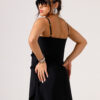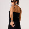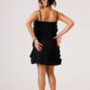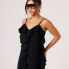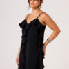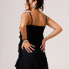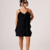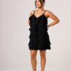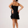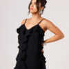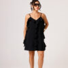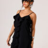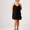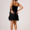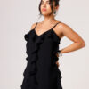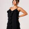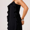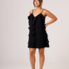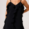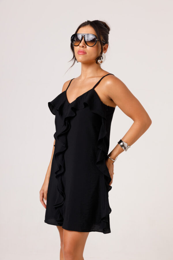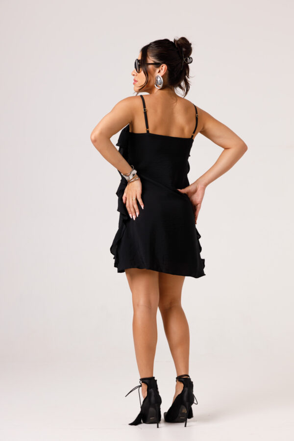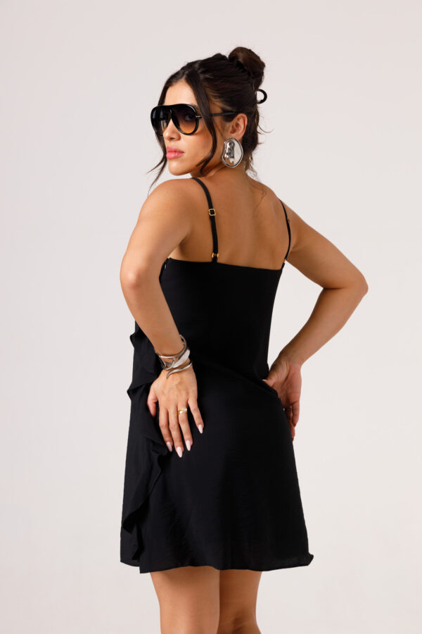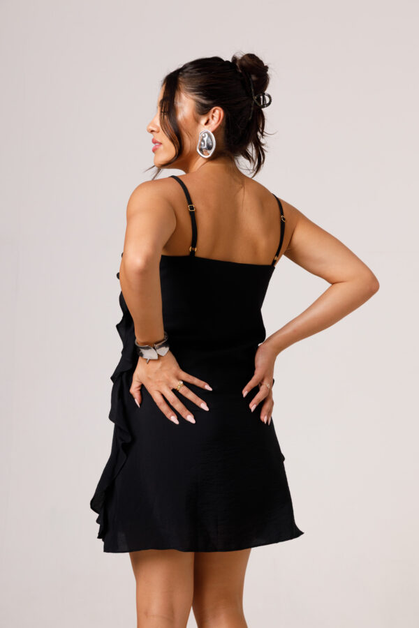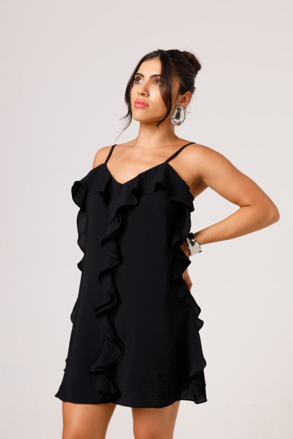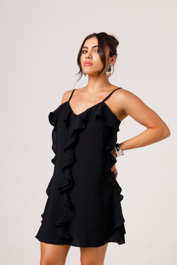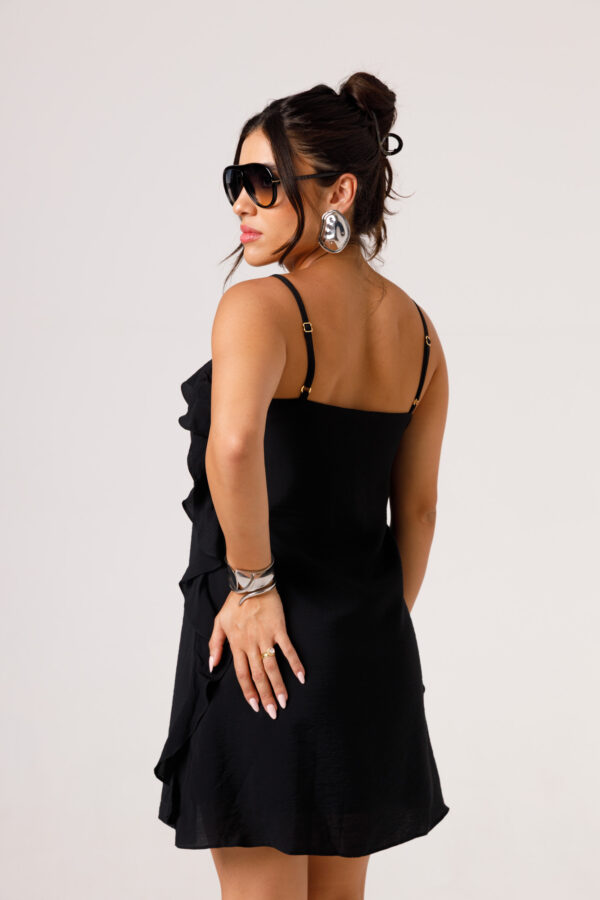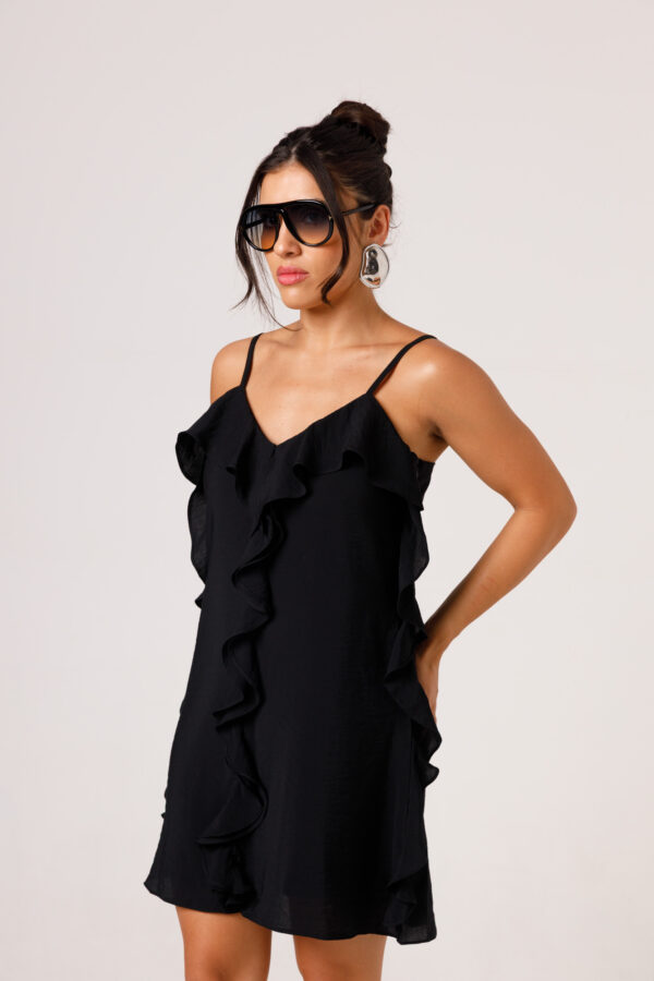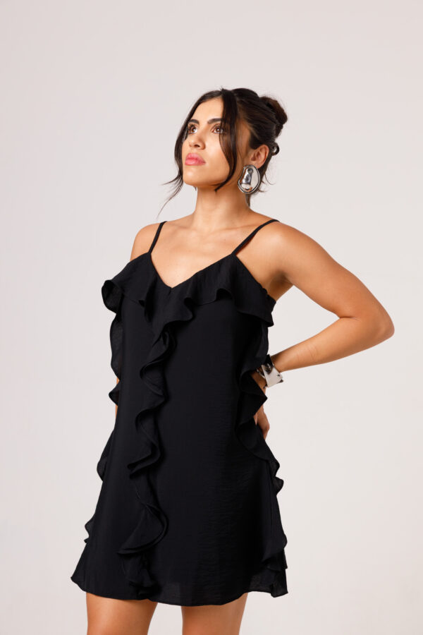 Vestido curto com babados frontais, alças finas e modelagem soltinha disponível nas cores Preto.